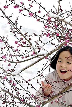 16日﹐在連續三天降下暴雪的濟州島﹐30年生梅花樹盛開着火紅的花朵﹐正在自炫其美.