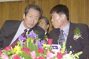 9日,大韓足球協會會長鄭夢准(左)和前任國家隊教練車范根在漢城汝矣島高中的足球隊成立儀式上,肩挨肩坐著,交頭接耳地談什麼.