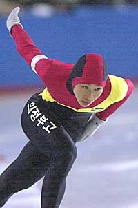 第82屆全國冬季體育大會第一天舉行的速滑比賽男高部500米比賽中,一高中選手奔馳在賽場.