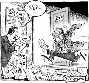 按照2月份的日程安排,自民聯名譽總裁金鐘泌跑出辦公室(辦公室意味著民主党和自民聯的合作體系).大國家党總裁李會昌在外邊看著這個情景.