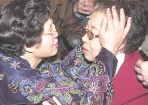 69년 KAL기 피랍사건으로 북에 끌려갔던 승무원 성경희씨(왼쪽)가 26일 평양 고려호텔에서 만난 어머니 이후덕씨의 얼굴을 두손으로 감싸안으며 흐느끼고 있다.