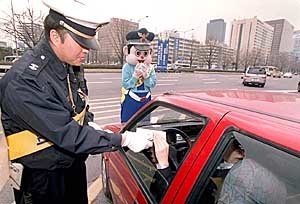 2日﹐交通管理部門針對不系安全帶行駛的駕駛員開始進行處罰。圖為交通警察在漢城鐘路區世宗路政府中央廳舍進行處罰時的情景。據統計﹐當天的檢查發現﹐90%以上的駕駛員系好安全帶行駛。但出租車司機對不系安全帶而罰款有所不滿﹐部份出租車司機與警察還發生了小小的衝突。