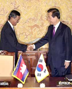 洪森說﹐韓國向柬埔寨提供的援助對柬重建家園有重大的意義﹐他對此表示感謝。他還希望韓國繼續提供援助。金總統承諾﹐為了民主主義與市場經濟並行發展﹐將從人道主義的立場出發﹐積極考慮對柬提供進一步的援助。
