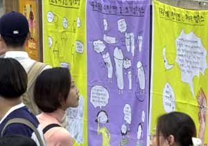 “大學校園裡頭怎麼有了保險套﹑女性保險套﹑處女膜什麼的﹖”10日延世大學總女學生會在學生樓前﹐向女生們介紹避孕工具的使用方法或贈送月經週期手鐲等﹐進行了“以女性為中心”的性教育活動。