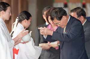 日本自民黨總裁候選人﹑政調會長龜井靜香﹐17日參拜靖國神社後﹐神社有關人士給他贈送神酒。