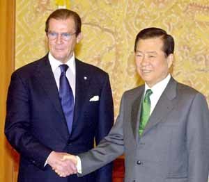 金大中總統(右)19日在青瓦臺會見以聯合國兒童基金(UNICEF)友好大使資格訪韓的電影演員羅杰‧摩爾﹐就兒童問題交換了意見