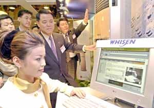 LG電子推出利用因特網進行遠程遙控﹑監視和自身診斷的“因特網空調”。25日在汝矣島LG總部﹐一個助手向金雙秀社長等人介紹上網控制空調的試用方法。