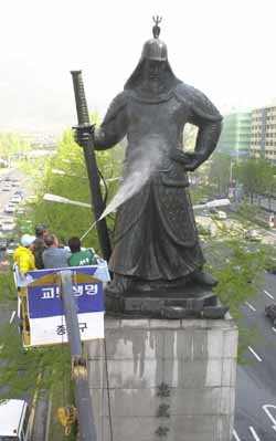 李舜臣將軍也為迎春披上迎春盛裝。26日﹐李舜臣將軍誕辰456週年前兩天﹐漢城鐘路區廳公務員和教保生命職員等人利用大型起重機和高壓噴霧器﹐對位於漢城世宗路的李舜臣將軍銅像進行了清潔工作。