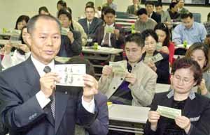 外換銀行26日在總部大禮堂聘請識別專家徐太石科長﹐針對百貨商店﹑一般銀行﹑大使館等與外匯打交道的人士﹐進行了偽鈔識別方法的教育。