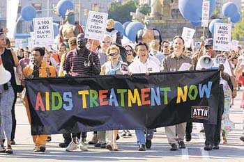 7日,正在舉行第14次世界艾滋病總會的西班牙巴塞羅納,在大街上示威遊行的隊伍高呼“現在馬上採取消除艾滋病的措施!”。