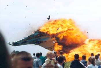 27일 우크라이나의 에어쇼 행사장에서 화염에 휩싸인 채 추락하고 있는 SU 27(수호이) 전투기.