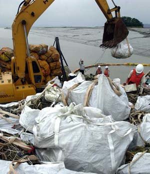 12日下午,在仁川江華郡江華邑吉祥面下水道的垃圾清理現場,韓國海洋污染防止組合所屬人員正在清理數量龐大的垃圾。隨著此次大雨從漢江漂下來的垃圾流入東海,致使位於西海岸的養殖場蒙受巨大損失。