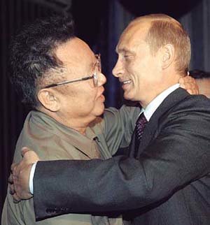 23日,北韓國防委員長金正日(左)和俄羅斯總統普京在符拉迪沃斯托克會晤。會談之前兩位首腦愉快地擁抱在一起。據悉,兩位首腦在會談上主要就經濟問題交流了意見。