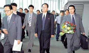 27日,南北經濟合作促進委員會北方代表團到達仁川機場正走出出口。站在中間的爲首席代表朴昌聯。