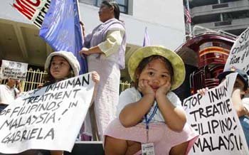 3日,一名兒童在馬卡迪馬來西亞駐菲律賓大使館前發生的抗議示威中疲憊不堪地坐在那裏。這些兒童譴責說,馬來西亞警察在驅逐菲律賓非法移民過程採取了性暴力等非人道主義行爲,所以主張抵制馬來西亞商品並拒買機票。