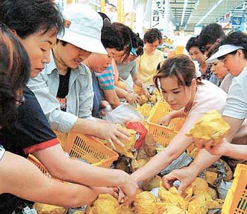 因遭受颱風“鹿莎”的襲擊水果損失慘重。4日,慶南昌原市“農協一家人俱樂部”爲幫助果農而設的“賠本銷售落地水果”櫃檯前,家庭主婦們在爭先恐後地購買。