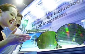 9日,在漢城江南區三成洞韓國貿易中心舉行的“韓國半導體産業大展”上,三星電子職員們首次展示了提高LCD液晶顯示幕鮮明度的8英寸“RSDS Wafer”。由韓國半導體産業協會主辦,130多個企業參加的此次展會將舉行至11日。