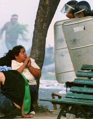 17日,在巴拉圭首都亞松森,兩萬多國民爲抗議政府的腐敗行爲而舉行了示威,並要求現任總統路易斯·岡薩雷斯·馬基立即下臺。圖片中,前來鎮壓的警察正要揮起警棍,婦女合著雙手乞求警察別動手大她。在當天的鎮壓示威過程中,有200多名受傷,有300多名被捕。