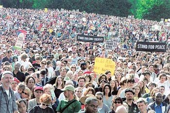 6日,兩萬多名美國人聚集在美國紐約中心公園,高舉寫著‘堅守和平’的標語牌,正在舉行反對美國進攻伊拉克的示威。