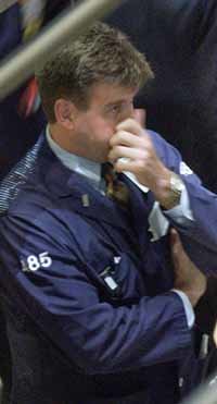 7日,在紐約證券交易所,一位經紀人在以嚴肅的表情看著行情顯示板。當天的紐約證券市場由於受到專家們發表的各企業的3、4季度的業績將進一步惡化的預測的影響,股價一路狂瀉。