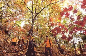 迎接全面到來的秋遊,13日(假日)登上北漢山的一家人正在邊觀賞楓葉邊走下山。