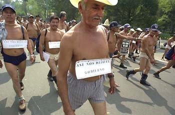 16日,指責《耕地法》修改案流産的墨西哥韋拉克魯斯農民聚集在墨西哥城,脖子上挂著寫有“政府使我們一無所有”標語的牌子,身穿內衣,正在進行示威。