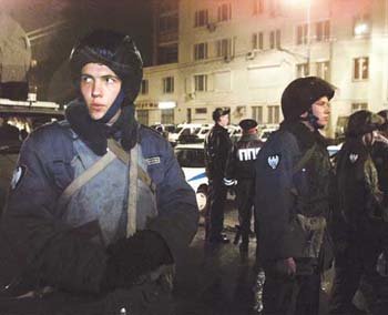 24日淩晨,俄羅斯武警對車臣反政府武裝闖入扣壓人質的莫斯科文化會館周圍加強警戒。據被釋放的幾名人質稱,身上包著炸彈的車臣反政府武裝人員中包括三四名女性。