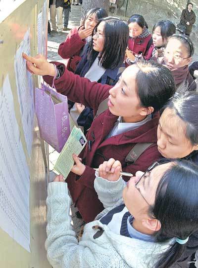 5日,在漢城梨花女子高中操場上,爲參加高考的高三考生們正在看貼在學校告示板上的教室安排表。