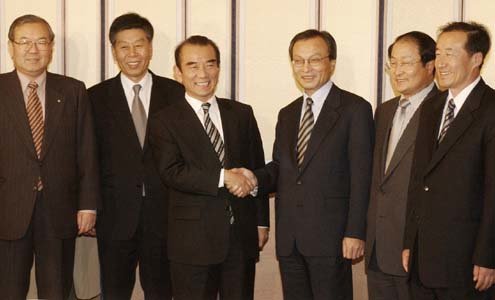 9日,盧武鉉-鄭夢准候選人單一化協商團的民主黨方面團長李海瓚(右三)和國民統合21方面的團長李哲(左三)正在首次正式會面中握手。