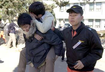 27日,因取暖爐的過熱而發生火災的江原春川市樂園洞的春川高中,被有毒的氣體窒息的學生被背在同學的背上護送去醫院。當天的火災造成30多名學生被煙窒息或擦傷。