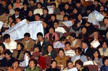5日,高考專門學院中央學院在漢城城均館大學舉行的2003學年大學入學考試說明會上,考生和家長在認真聽講。