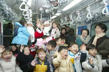 17日,漢城地鐵7號線首次運行。在7號線聖誕、新年文化列車啓動儀式中孩子們愉快地參觀以氣球、聖誕樹裝飾的車廂。這一列車將運行到明年2月16日。