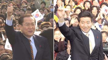 第16屆總統選舉的前一天18日,大國家党候選人李會昌(左)和民主黨候選人盧武鉉在漢城市中心展開了最後的街頭遊說,並各自呼籲對自己的支援。