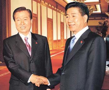 23日,金大中總統和新總統當選者盧武鉉在青瓦台舉行了大選後的首次會晤,二人正在面帶笑容地握手。