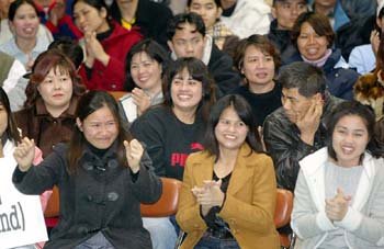 29日,參加由位於漢城城東區外國工人中心在聖水2街聖水工業高中舉辦的“第5屆外國工人辭舊迎新慰問宴會”的外國人正在面帶愉快的表情鼓掌。
