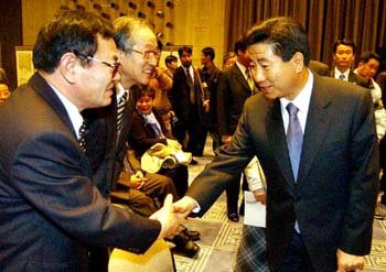 總統當選人盧武鉉(右)於6日下午參加了在漢城中區太平路韓國新聞中心舉行的市民社會團體新年慶賀儀式,正在與市民、社會團體的元老們打招呼。