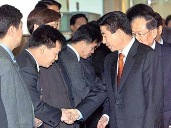 8日,下屆總統盧武鉉(右)來到中央人事委員會正在與職員們親切握手。