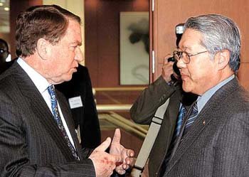 10日,出席在世宗路政府中央辦公大樓別館外交通商部大樓舉行的討論會的美國駐韓大使托馬斯·赫巴德正在與外交通商部長官崔成泓就最近的北韓問題進行討論。