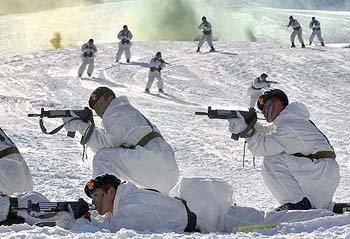 16日,在江原平昌郡黃柄山訓練場舉行了海兵搜查隊冬季訓練,參加的海兵隊員們正滑著雪進行機動訓練。