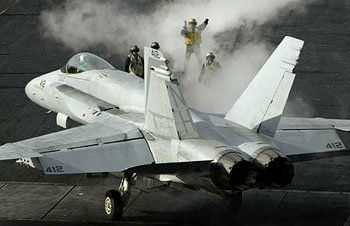 28日爲向伊拉克派兵,在加利福尼亞沿岸進行爲期三周的集中訓練後的F18戰鬥機正在做從Nimitz級航空母艦起飛的準備工作。