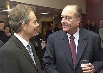 17일 이라크 문제를 논의하기 위한 유럽연합 긴급정상회의에 참가한 토니 블레어 영국 총리(왼쪽)와 자크 시라크 프랑스 대통령이 얘기를 나누고 있다. 이날 정상회의에서 유럽 15개국은 공동성명을 발표하는 등 분열상을 미봉했지만 언제 다시 불거질지 모르는 상황이다.