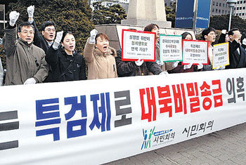 21日上午,“公正社會市民聯帶”成員們在漢城汝矣島車站前正在進行敦促“查明對北秘密支援疑惑”的示威。