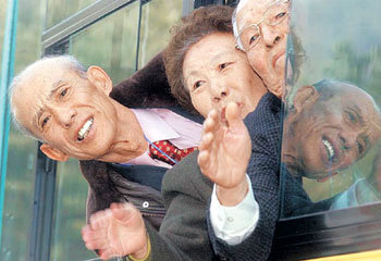 25日,結束第6次南北離散家屬會見日程,離開金剛山賓館的離散家屬們正在依依不捨地揮手道別。