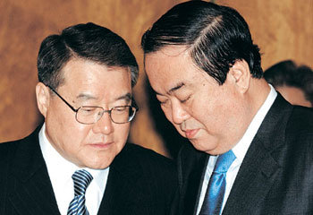 5日上午在青瓦台首席秘書及助理會議的舉行之前,國家安保助理(左)羅鍾一和秘書室室長文喜相表情嚴肅地在討論著什麽。