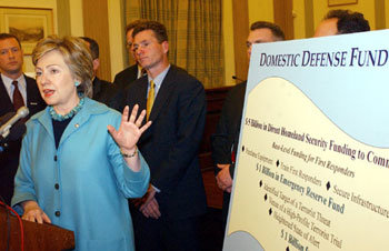 6日,美國紐約州參議員希拉裏(右)在華盛頓國會議事廳召開的記者招待會上,正在對“爲救護活動而籌集國土防禦基金”的新法案進行說明。