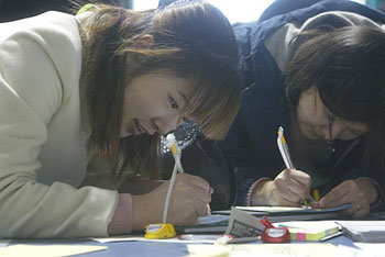 13日下午,在安養市青少年訓練館舉行的京畿道招聘博覽會上,參加的求職者正在認真地填寫資料。由72家京畿道內的公司參加了此次招聘博覽會,有421人被聘用。