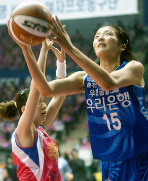 14日,Woori銀行隊在獎忠體育館進行的Woori金融集團杯2003女子職業籃球冬季聯賽與三星生命保險隊的冠軍總決賽第三場比賽中以91比76取得了勝利。