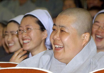 14日,參加在漢城中區明洞教堂舉行的佛教影片《童僧》試映會的尼姑和修女露出了歡快的笑容。