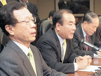 31日,在大國家黨最高委員會會議上,新聞特委委員長最高委員河舜鳳(中)正在嚴厲指責盧武鉉總統的新聞官。
