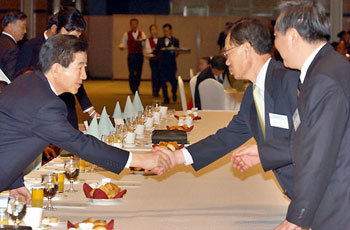 9日,參加在漢城COEX大會議廳舉行的第35屆國家早餐祈禱會的盧武鉉總統正在與大國家党代理代表朴熺太握手。